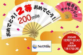 ネットマイルが年末年始百万マイルくじを開催している(12/21〜1/17)。毎日一回チャレンジできて、1等が当たると10,000マイル当たるらしい。昨日からやってみて今日もがらがら回してたら、2等が当たったよ。