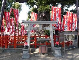 樹齢千年を超える大楠です。もともと、楠の神秘的な霊力に祈りを捧げて、根元に設けていた社にお稲荷さんを祀るようになったのが始まりらしいです。 |