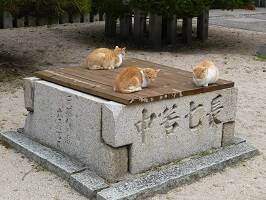 それ以来、阪神ファンが多く訪れ、優勝祈願だの、城島捕手阪神入り祈願だの書かれた板(たぶんまな板)だったり、メガホンがいっぱい置かれていた。境内に住み着いてるらしき猫もトラ猫ばかり!? ぷちだぼんがそろそろつまらない顔してきたぞ。もうちょっと待ってね〜。 |