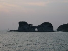 白浜の円月島。ちょうど太陽が沈むときだったけど、あの丸のところには来なかったな。結構左側に日が沈んだ。見る場所が違うのか、季節が違うのか。でも、なかなかきれいだったよ。 |