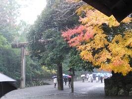 こちらは平成24年11月に参拝したときの、秋そして雨の伊勢神宮。鬱蒼とした木々の緑の中、所々にもみじが紅葉していて鮮やかでした。雨なんでアレですけどね。 |