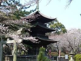 だーれもいないので、境内を独り占め。三重塔、五重塔好きとしては、たまらないね。桜も咲いていてなかなか絵になるではないですか。名所もいいけど、こういうところ好きよ。神仏習合の名残で鳥居と三重塔のセットってのもいい。 |