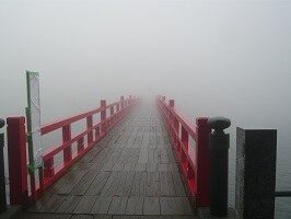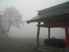 一瞬だけ霧が晴れて鮮やかな朱色の社殿がお目見え。濃い霧に包まれてたのがサーっと引いて現れるのだから、なんだか神様出てきた?みたいな感動を覚える。霧が晴れたのは一瞬でこの後また霧に覆われる。霧の中を歩いているとびしょ濡れになることを初めて知った。まぁそうか。 |