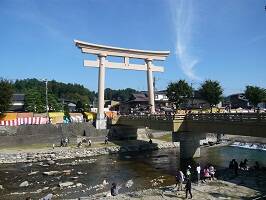 急に決めた飛騨高山行き。高山祭当日とは知らずに・・・。人ごみ嫌いの私は暫し迷う。櫻山八幡宮に行くか、やめとくか。でも待てよ?高山祭の日になんかなかなか来れないのでは?おかげで2時間も特急で立つ羽目になったんだし。場所的には意外と近い飛騨総社にいたんだし。ってことで向かうことに。川のところまで来た。うっわ、凄い人出。 |