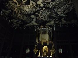 法堂(=拈華堂(ねんげどう))の双龍。これが意外と最近描かれたもので、創建800年を記念して平成14年(2002年)に描かれた。最近描かれたものだから、写真もOKなのかしら?最近でもこんな凄い絵描ける人いるんだぁって思った。 |