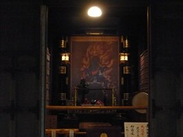 中から観賞した後には、お庭に出ることができました。で、外から本堂の東側に回るとちょうど国宝の青不動画像(複製写真だけどね)が見えるようにいい感じに扉が開いている。ちなみに、こちら日本三不動のひとつです。大津園城寺の黄不動、高野山明王院の赤不動とで青・赤・黄です。 |