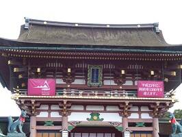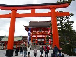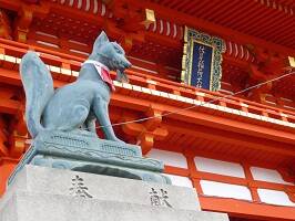 全国に30,000社あるといわれる「お稲荷さん」の総本宮の伏見稲荷大社です。一説によると和銅4年(711年)伊侶巨秦公(いろこのはたのきみ)が勅命を受けて伊奈利山(稲荷山)の三つの峯にそれぞれの神を祀ったことに始まったとされる。稲荷神の神使が狐さんだったので、狛犬ではなく白狐の像が置いてあるんだとか。 |