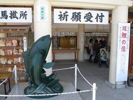 広島城址に鎮座する。廣島護國神社。あれ?廣島縣護國神社じゃないんだね。「縣」はつかないんだ。広島城は鯉城と呼ばれるだけあって、護国神社の授与所の両脇に鯉の像があった。なかなか鯉の像ってみたことないぞ。当日は結婚式をしていたので、邪魔にならないよう参拝しました。 |