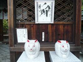 三井寺の「三井寺」駅側の受付近くに鎮座する三尾神社。何の予備知識もなくいったので、境内のあちこちにウサギがいて驚いた。手水舎もウサギの口から水が出ているし、神紋も「真向きうさぎ」であり、社殿前には「めおと卯」がでんっ!と待ち構える。 |
