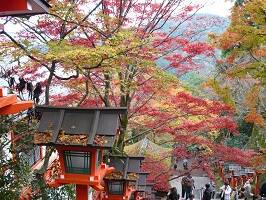 天気はイマイチで曇り、たまに小雨ちらつく中、上ってくと段々と綺麗な紅葉になっている木も増えてきた。石段と灯篭、そして紅葉がいいじゃないですか。写真の腕がもっとあったらね。よかったのにね。 |