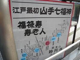 何故かコチラ妙圓寺の写真が全然ないぞ。本堂の写真すらないのは、なんでだろ?しょうがないから「江戸最初山手七福神」の看板を載せてみる。コレあちこちにあって、あれ?迷った?とかいうときにこの看板を見ると心強い。あ、あってる。って安心できていいね。 |
