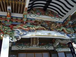 到着〜って思ったら、ちょっと派手な二の鳥居をくぐりもうちょっと坂と階段を上り、ようやく到着。金色を使った少し豪華な本殿。それもそのはず平成21年に社殿改修が竣功したばかり。本殿一面に彫刻が施されており、立派な本殿でした。 |