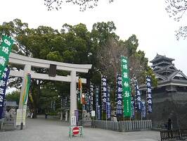 若干の心配をしつつも熊本城を満喫したあと、頬当御門(ほほあてごもん)から出て、加藤神社に向かう。なんとか人がいることを確認しほっとする。たまたま結婚式の撮影をしていてそのおかげかな?それにしても間に合ってよかった。 |