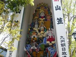 境内には飾り山笠が2つあり見事でした。写真はそのうちのひとつ、標題「古事記献上一三〇〇年日本曙 」 らしい。これって毎年作るの?博多祇園山笠は七百七十年の伝統を誇り、櫛田神社の祇園神(素盞嗚命)に対する氏子の奉納神事です。って。(調べたところ2つじゃなくて、表と裏(見送りと言う)らしい) |