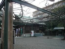境内には「千年の藤」と呼ばれる樹齢400年〜500年の藤の木があり、ほぼ境内中を覆っている。昔は大きな欅の木にからまっていたそうだが、落雷に遭い現在は電柱を2本立てている。見ごろはちょうどゴールデンウィークの頃。参拝した3月はまだまだで葉すら出ていなくて寂しい感じだった。 |
