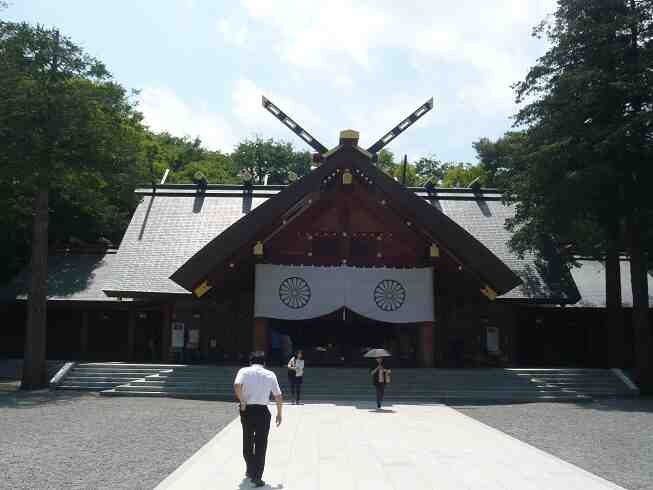 北海道神宮本殿。この後も幾つかの神社を訪れたけど、北海道の神社はこの造りが多い気がする。何造りって言うかは忘れた。やはり雪の重さに耐える必要があるからかしら。 |