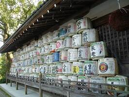 酒造りにゆかりのある秦氏が現在の場所に本殿を作ったことから、「酒の神様」として信仰を集めているとのこと。後ろの松尾山からキレイな水が流れてくるので酒造りにもよかったのでしょう。境内には酒樽が積まれていた。全国の酒造家より奉納されたものらしい。 |