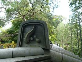 瓢鮎図は、足利義持の命により、瓢箪でナマズを押さえるという禅の公案を描いたもので、最古の水墨画として教科書とかでも出てくるらしい。覚えてないけど。散策していて見つけたのがコレ(右の写真)ナマズと瓢箪が瓦のところに!他も探したが見つけられたのはここだけだった。他にもあるのかしら。 |