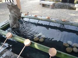 手水舎の水のなかにも梅が。上手に石で形どってますね。ふむふむ、なかなかセンスがよいわ。模様じゃなくって石で梅の形になっているのがいいね。岡崎天満宮のお気に入りポイントです。ん?梅でいいんだよね? |