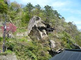 金乗院からの眺め。岩に喰われるように胎内堂がある。写真では見えないが岩穴があり、かつては岩穴を這って胎内堂に出ることができたらしい。山寺での修行って命懸けだったのかな??? |