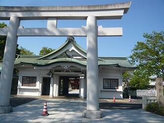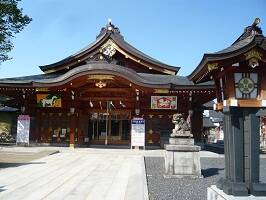 山形駅から延びるまっすぐな道沿いに鎮座する。石造りの白い鳥居と白い神門?がよく目立つ。この神門?を通り過ぎようとしたら、突然水が出た。柱に設置されている自動センサーつきの手水舎だった。柄杓とかは置いていない、実に今風でハイテクな手水舎だ。神門?の中には御神輿が置いてありました。 |