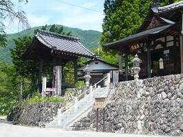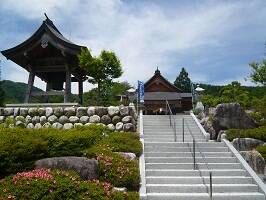 最澄(伝教大師)は神坂峠のあまりの急峻さに驚き旅人の苦難を見かね、美濃側(現在の岐阜県中津川市)に広済院、信濃側に広拯院という布施屋を建てる。広拯院は現在の広拯院「月見堂」と比定されている。一方、美濃側の広済院は建てられたことは分かっているが、場所がはっきりしていない。左の写真が月見堂。大本堂落成後は護摩堂とされる。 |