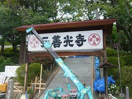 昼神温泉から30分くらいかしら?車を走らせ飯田の元善光寺へ。長野市の善光寺にある本尊「善光寺如来」が元々安置していた場所で、いわば善光寺の実家というところか。山号は長野市の善光寺と同じ「定額山」で、元善光寺と名付けられる前は坐光寺(ざこうじ)と呼ばれていた。住所も座光寺だしね。交差点の名前も座光寺だった。 |