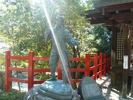 その古木の隣には宮本武蔵のブロンズ像が立ってます。写真を撮ったら、光が写りこんで刀でシャキーンって切った瞬間みたいになった。御朱印にある緑色の宮本武蔵の姿はこの銅像のようだ。見比べて見ると台座のところまで忠実に再現してる。 |