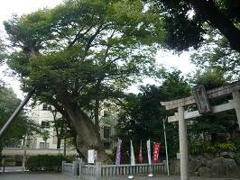 鳥居前には調布市随一の欅(ケヤキ)の巨木があり、昭和47年調布市天然記念物に指定されている。幹はおよそ5.5m、高さ34m樹齢数百年だが今でも生き生きとしている。「江戸名所図解」に「社前槻(ツキ=欅の古い呼び方)の老樹あり、数百余霜を経たるものなり」とあり、文化文政の頃からすでに目立つ巨木だったらしい。 |