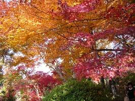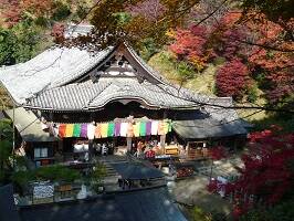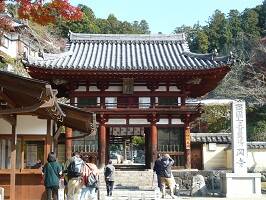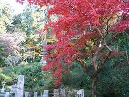 最初は普通の上り坂だったけど、確かに危険だわってほどの急坂。30度くらいある感じしたけど、そんなにはなかったんだろう。息も絶え絶えなんとか到着。モミジが紅葉まっさかりに穴場スポットでした。昨日の長谷寺に比べると俄然人は少なく、紅葉は同じくらい。がんばって登ってきてよかったよ〜。 |