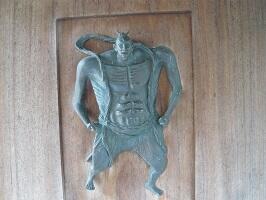 仙石原の交差点、T字路のところをまっすぐ進む。この先車で行ける?って感じがしなくもないが、駐車場が先にある。門をくぐると、門の扉のところになにやらおっかないヤツがくっついてる。なんだろ?聞けばよかったな。 |