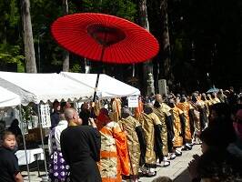 参道を歩いていたら、なにやらみんなが立ち止まって道をあけている。なんだろと思ってたら、僧侶たちが行列でやってきた。奥之院で行われる法会に行くようだ。たまたまだけど、こんなところに遭遇できてラッキーだ。奥之院で大人数での般若心経(かな?)は壮観でした。 |