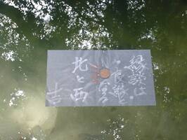 この鏡の池しゃがんで浮かべるとき、落ちそうになるから要注意です。透き通ってるから一見浅そうに見えるけど、よく見ると深そう。占い後、御朱印を頂く。待っている間にプチハプニング。ぷちだぼんが騒いでる。足にモサモサした虫が!どーせ、タオルとかが触れてそんな感じがしたんじゃろ? |