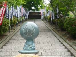かなり広い駐車場に到着するも、1台も止まっていない・・・。しかもさらに参道があり、敷地もやたら広い。間に合わないかと思ったけど、ダメ元で行ったらなんとか間に合った。目の薬師さんってことで参道に目玉の親父があちこちに。 |