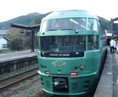 「鳥栖」駅〜「由布院」駅までは、期待していた「ゆふいんの森」 こちらは景色が良く見えるように座席が高い位置にあるんだけど、その分揺れるのよね。乗り心地自体は「かもめ」のが断然よかった。九州って観光特急が色々あって楽しい。 |