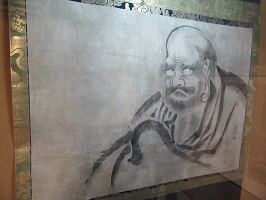 雪舟が書いた(って書いてあった)達磨大師さん。豪快だけど繊細という感じがまさにぴったり。ちょっと躊躇したら全体がダメになってしまいそうだ。 |