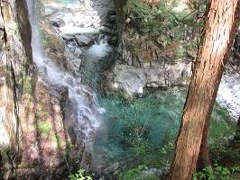 さて、不動滝を目指す往復30分くらいのコース。「峡」と言うくらいだから、もちろん下る。ということは帰りは登る。ふぅー。つい帰りのことを考えてしまうのは歳取った証拠か。それはさておき、自然の中を歩いて、滝壺がエメラルドグリーンだったり、かなりリフレッシュしたー。 |