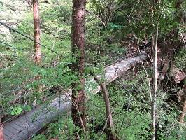 もう1つ滝があるらしいので、別の道を行ってみる。「3人以上で渡らないでください。」という注意書きがある吊り橋。かなり高い。余裕かなと思ったら、真ん中辺りでかなり揺れる。これは下を見たらアウトだ。前だけを見ていくべし。が、その先崖崩れのため、進入禁止とな。もっと先に書いてくれ! |