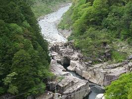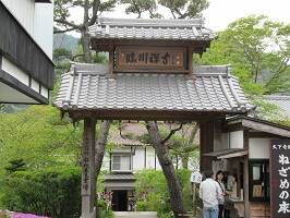 本当は川のところまで降りて行って寝覚めの床に行ってみようと思ったんだけど、駐車場から全景見えるではないか。調査ではかなりハードなことが分かっていたので、うん、こっから見るだけでいいねと全員の意見が一致。そば屋の駐車場のところから景色を満喫。臨川寺だけ参拝することに。 |