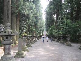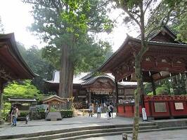 日本最大の木造の鳥居(らしい)を通り、隋神門を抜けると立派な杉や桧に囲まれて拝殿があります。この鳥居、厳島神社の鳥居より大きいのかなぁ。分かんないや。いろんなところで日本最大って言葉聞いたな・・・。奥には富士登山道吉田口が。ここから富士山に行けるんだねぇ。 |