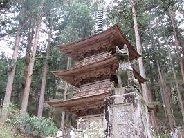 霊犬、早太郎ちゃんと立派な三重塔。この三重塔、雰囲気あっていいわぁ。この早太郎ちゃんには磐田(静岡)の見附天神で人物供養という悲しい習わしがあり、この早太郎ちゃんが娘をさらう怪物を退治したという伝説がある。(磐田では、悉平太郎と呼ばれている早太郎ちゃん) |