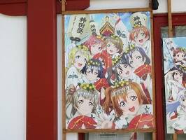 神田神社に行くと目に付くのが、ラブライブの幟やら看板やら。社務所と逆の特設物販所みたいなところをのぞいたら、アニメ関連の絵馬とかたくさん売ってました。ラブライブは知らないんだけど、どうやらアニメに神田神社がよく登場したらしい・・・。 |